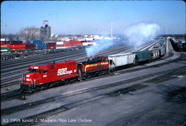 Soo 4100 and a CP MP15 are leading the BN Transfer out of