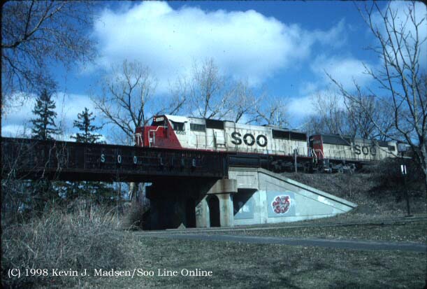 The Soo Line was never shy about putting its' name on bridges. Most of these survive on the present-day CP. Here SD60 6021 and another SD60 pass a Soo Line bridge near the Mississippi River in Minneapolis.