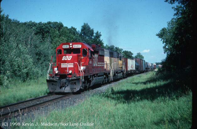 Soo 6602 and HLCX 4061 are pulling CP #565 through Plymouth,