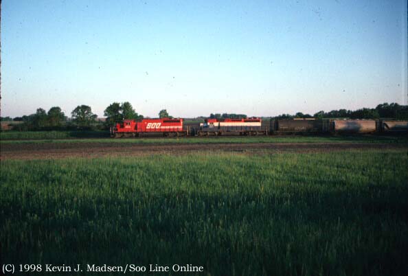 Soo SD40-2 6623 and a lease unit. The two units are in charge of train