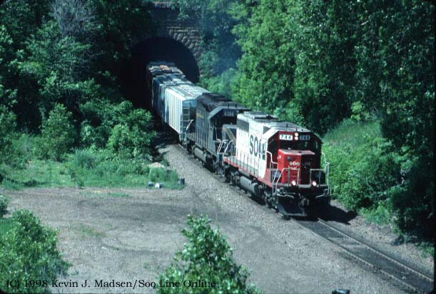 CP #374, a loaded grain train, is shown exiting the tunnel